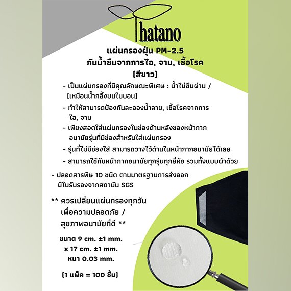 - แผ่นกรองฝุ่น PM-2.5 แผ่นกรองที่มีคุณลักษณะพิเศษ : น้ำไม่ซึมผ่าน (เหมือนน้ำกลิ้งบนใบบอน)